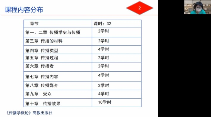8月29日是《传播学概论》的第一次课,首先介绍本门课程的总课时为32学时,每章涉及具体内容和课时分布,以及考核方式、分值构成、课堂要求等事项。各章节都会通过客观题检测学生学习效果,让学生知道《传播学概论》课程内容是什么,怎么学。讲完课程学习要求之后,进入第一章传播学史和第二章传播内容学习。