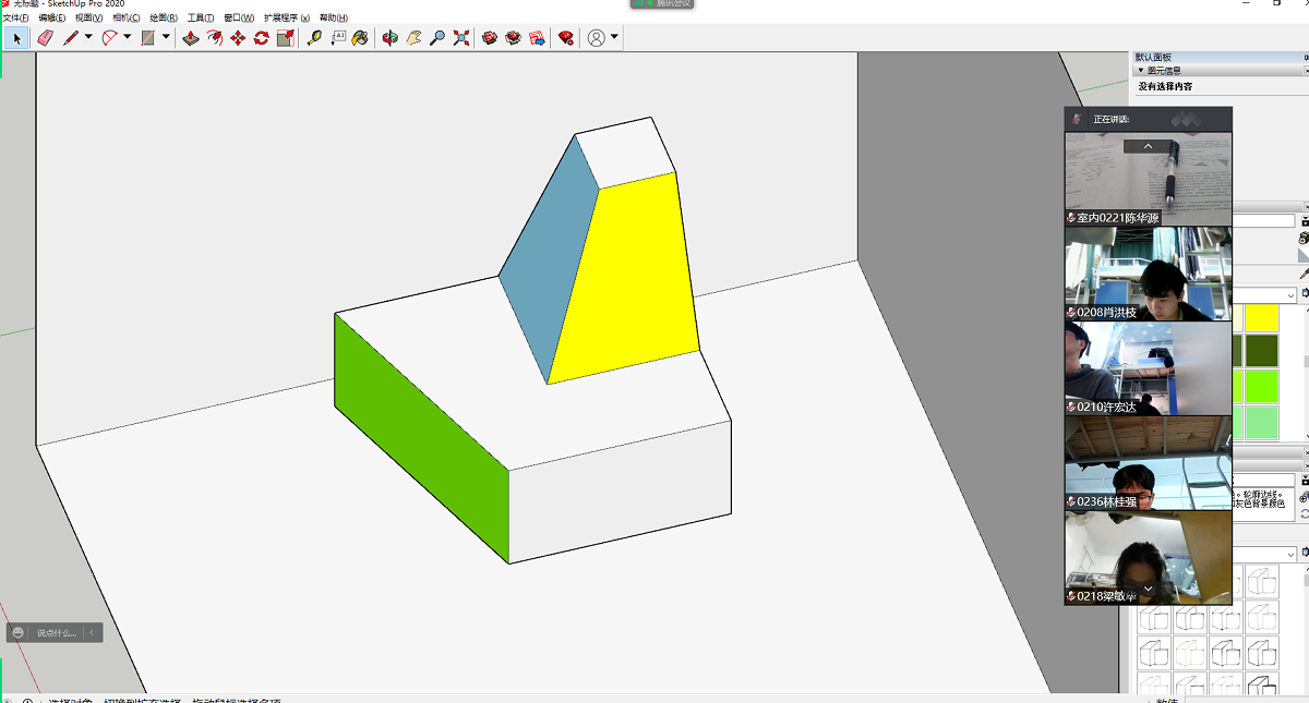 在第一、二周的线上课程教学中,首先组建2021级建筑室内设计1、2班班级QQ群,通过QQ群发布学习任务及交流学习心得:其次使用腾讯会议进行线上授课,采用固定的会议号及无密码进入方式,方便学生进入直播间学习的同时,也利于教学督导顺利进入教学直播间监督、评估教学工作:最后通过照片的方式将课后练习作业收集给班长,由班长统一打包发给老师批改。